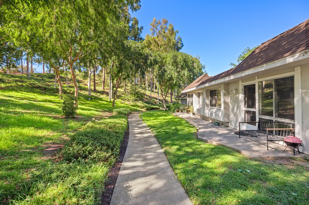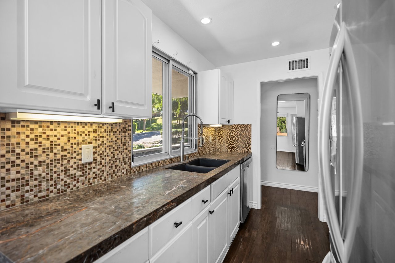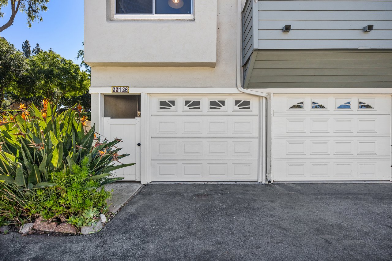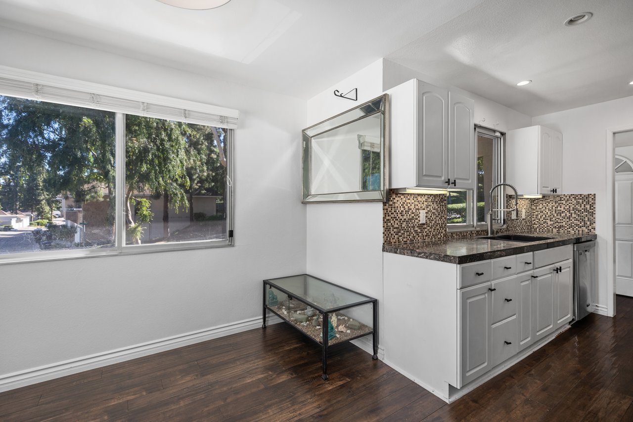 Welcome to 22126 Caminito Vino, a beautifully upgraded upper-level end unit nestled in the highly sought after Laguna Village community of Laguna Hills. This light-filled residence offers privacy, comfort, and stylish living with serene greenbelt views. Step inside to discover an open and inviting floor plan featuring wide-plank laminate wood flooring, recessed lighting, and a cozy fireplace that anchors the spacious living room. The kitchen is thoughtfully designed with crisp white cabinetry, granite countertops, stainless steel appliances, and modern fixtures situated for everyday living and entertaining. The adjacent dining area flows seamlessly into the living space, creating an ideal layout for gatherings. The generously sized primary bedroom offers a peaceful retreat with direct access to a private patio overlooking lush landscaping. A versatile second bedroom functions beautifully as a guest room, home office, or den. Freshly painted throughout. Additional highlights include an interior laundry area with side-by-side washer and dryer, newer doors throughout, and two detached single-car garages located conveniently below the unit, along with abundant guest parking. Residents of Laguna Village enjoy resort-style amenities including pools, spas, tennis courts, basketball courts, and a clubhouse—all set within beautifully maintained grounds. Turnkey and move in ready, this home combines comfort, convenience, and community living in one exceptional offering.