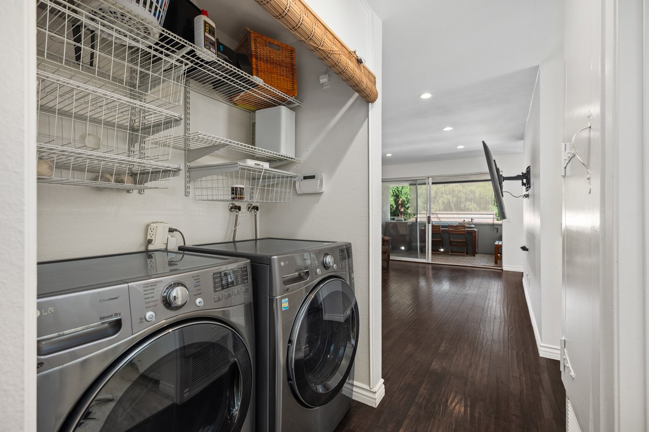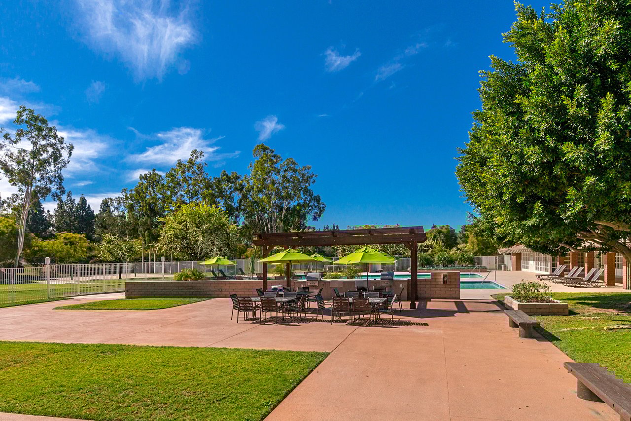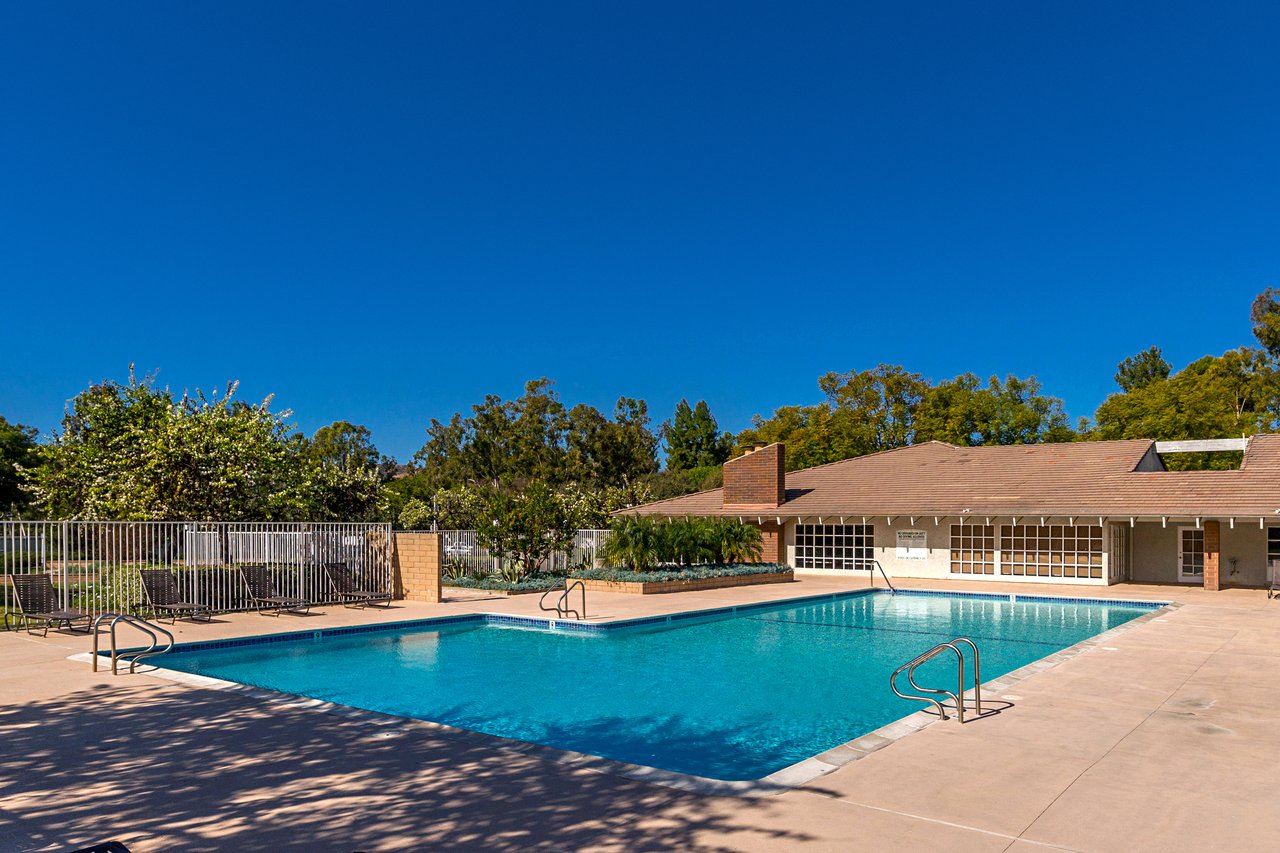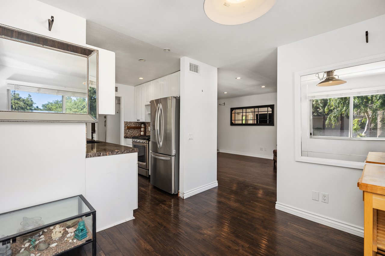 Welcome to 22126 Caminito Vino, a beautifully upgraded upper-level end unit nestled in the highly sought after Laguna Village community of Laguna Hills. This light-filled residence offers privacy, comfort, and stylish living with serene greenbelt views. Step inside to discover an open and inviting floor plan featuring wide-plank laminate wood flooring, recessed lighting, and a cozy fireplace that anchors the spacious living room. The kitchen is thoughtfully designed with crisp white cabinetry, granite countertops, stainless steel appliances, and modern fixtures situated for everyday living and entertaining. The adjacent dining area flows seamlessly into the living space, creating an ideal layout for gatherings. The generously sized primary bedroom offers a peaceful retreat with direct access to a private patio overlooking lush landscaping. A versatile second bedroom functions beautifully as a guest room, home office, or den. Freshly painted throughout. Additional highlights include an interior laundry area with side-by-side washer and dryer, newer doors throughout, and two detached single-car garages located conveniently below the unit, along with abundant guest parking. Residents of Laguna Village enjoy resort-style amenities including pools, spas, tennis courts, basketball courts, and a clubhouse—all set within beautifully maintained grounds. Turnkey and move in ready, this home combines comfort, convenience, and community living in one exceptional offering.